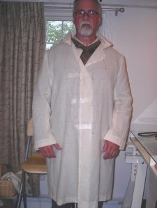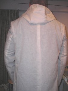 Here are pics of the final fitting muslin. Considering that I had never altered a pattern before, I’m pleased with the result. It’s come a long way from the first straightjacket, and it truly feels like it’s time to be moving on. The next step will be to prepare the wool. Get ready for the London Shrunk Method.