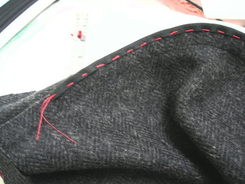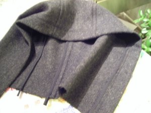 Ok. This pattern, as published, is for an unlined coat. All the seams call for bias tape to cover the raw edges. I really can’t imagine wearing an unlined wool coat, so I guess it must be something Japanese. Anyway, I plan on lining the coat with the exception of the hood. I don’t think I’ve ever seen anyone wearing this style of coat who would be caught dead with the hood up. Maybe in a blizzard when you’re trying to dig the car out of a ditch. I see the hood as more of a built in scarf / big floppy collar. I have decided to leave it unlined. Thankfully this will be the ONLY unlined part of the coat. I have never worked with bias tape before and found it moderately difficult to sew well. Because my fabric is fairly thick it just barely covered the raw edges. I did try a wider width, but it made the seams too stiff and inflexible. I ended up hand basting the seam binding to the edges and then stitching with the machine. The seam allowances were then pressed to one side and topstitched down. Time consuming, but in the end worth it. I’m just very glad I don’t have to do every seam of the entire coat.
