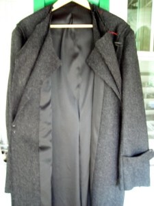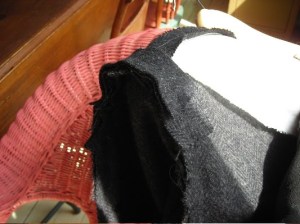 I need to get caught up with all the progress that I’ve made. I actually have a coat that I can put on, not that I exactly want to wear a wool coat in the middle of summer. The major pieces went together easily and I used my Bishop Method book which emphasizes sewing in the proper direction. Shoulder seams are sewn outward, vertical seams are sewn bottom to top. I don’t ask why, I just do what Edna says. After setting in the sleeves I beefed up the shoulders by hand sewing a 6″ and 4″ bias strip of wool over the sleeve cap. This really helped smooth out the sleeve cap. The coat, as designed, is unlined so I had to develop patterns for a lining. I used the sleeve patterns as is. The back was cut on the fold allowing for a 1″ center back pleat. The front lining required some calculating, but again the Bishop Method book was a big help. Because I want the lining to be free moving I needed to attach the leather toggles and tabs before attaching the lining to the coat. Each leather tab took well over 1/2 hour to sew on. 4+ hours of hand sewing later I’m just about ready to put the whole thing together. I just want to tweek some of the seam binding in the hood, and rip out and re-do a front seam where the lining and front facing connect. I sense being in the home stretch of this project. I’ve found a trench coat sew-along blog, and even though I’d be way behind everyone, I may jump in with my bargain olive green stretch denim.