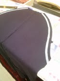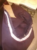 Here are some construction detail pics. The layout diagrams for this coat showed something (interfacing?) along the seamlines between the front and backs where they join the raglan sleeves. An expert sewist from Pattern Review advised me that this is a product called Wigan. It’s purpose is to reinforce the seam and to help it retain its shape since both the sleeve unit and front / back end up on the bias where they connect. Also the weight of the garment hangs off this seam and it can cause the coat to sag. Needless to say, this isn’t a product I was going to find at JoAnn Fabrics. I improvised by fusing a lightweight interfacing over the seamline. The twill fabric that I’m using can be easily stretched, it’s also way out of alignment as you’ll recall; so I’ve pinned and then hand basted every seam. The small amount of extra time that this step takes has been well worth it. Plus, I’ve come to actually enjoy the process. I’m using red and orange thread run through a block of beeswax, so I have a delightful aroma to enhance the zen of hand sewing. The improvised technique worked, with the stitching running through the strips of interfacing.