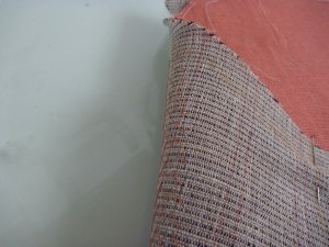 The seam allowances of the canvas must now be gingerly cut off. Talk about nerve wracking. One slip of the shears and hours of handstitching are down the drain. Once trimmed, 3/8″ twill tape is hand sewn onto the canvas at the seamlines. A strip is also placed next to the roll line and cross stitched into place. There’s a whole lot of zen going on here.