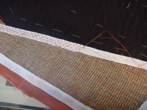 OK, moving along. The next step is to pad stitch the lapel area. I was really dreading this for some reason, but it wasn’t difficult at all. I think all the practice on the plastron paid off. The pad stitching begins along the roll line in parallel lines. This time, however, the pick stitches will be on the fashion fabric, so an attempt must be made to make them as small as possible. Fear not, it’s not hard to do. Plus the stitches will be on the back side of the lapel. After a few rows, maybe an inch into it, the lapel is rolled over into the position it will take on the jacket. Holding the lapel in position the pad stitching continues in rows until reaching the seam allowance. The lapel will now have a natural tendency to roll towards the body when the jacket is worn. Magic!
