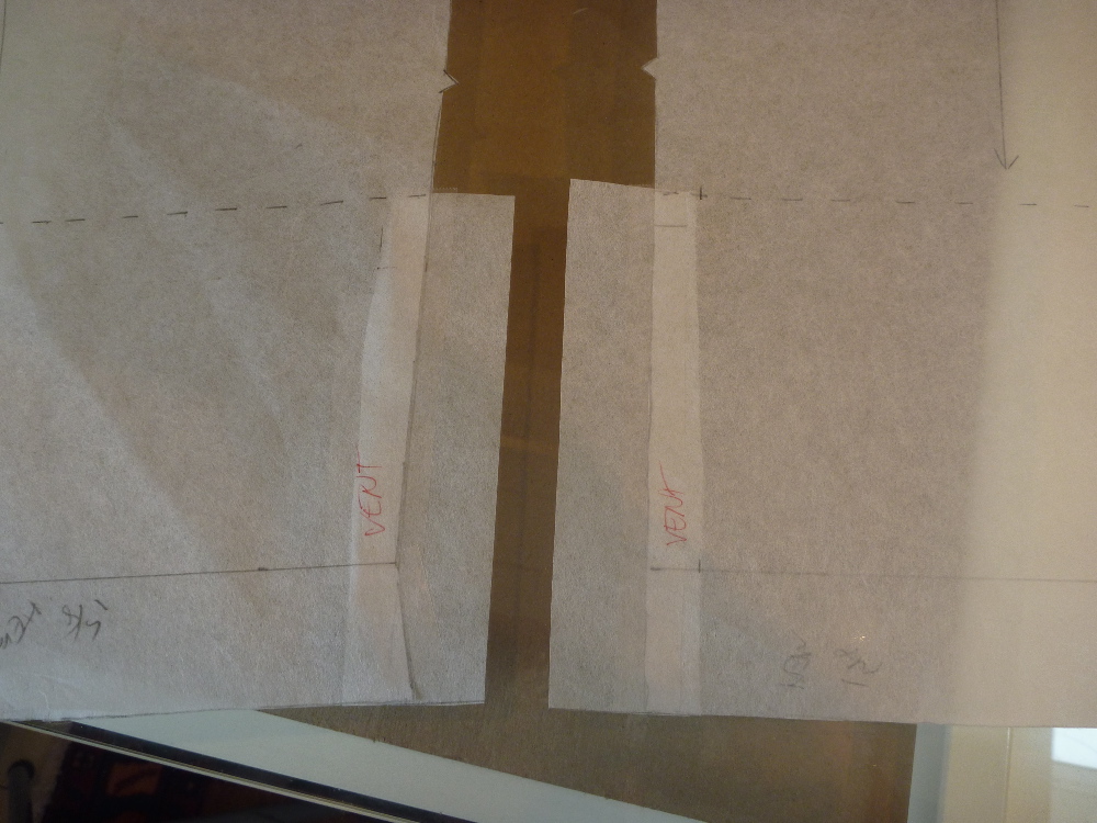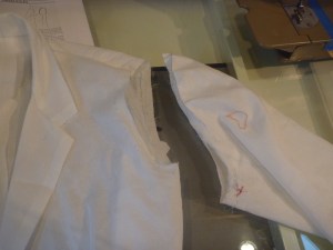 My pattern does not have vented sleeves, so I’m adding them by taping on a 1.25″ by 6.5″ extension to both the upper and under sleeve patterns. I also thought my muslin sleeves were a little long. I prefer to have some shirt cuff showing. So I shortened them by 3/4″. This was easily done by just sewing a tuck into the Swedish tracing paper. I just love the stuff!