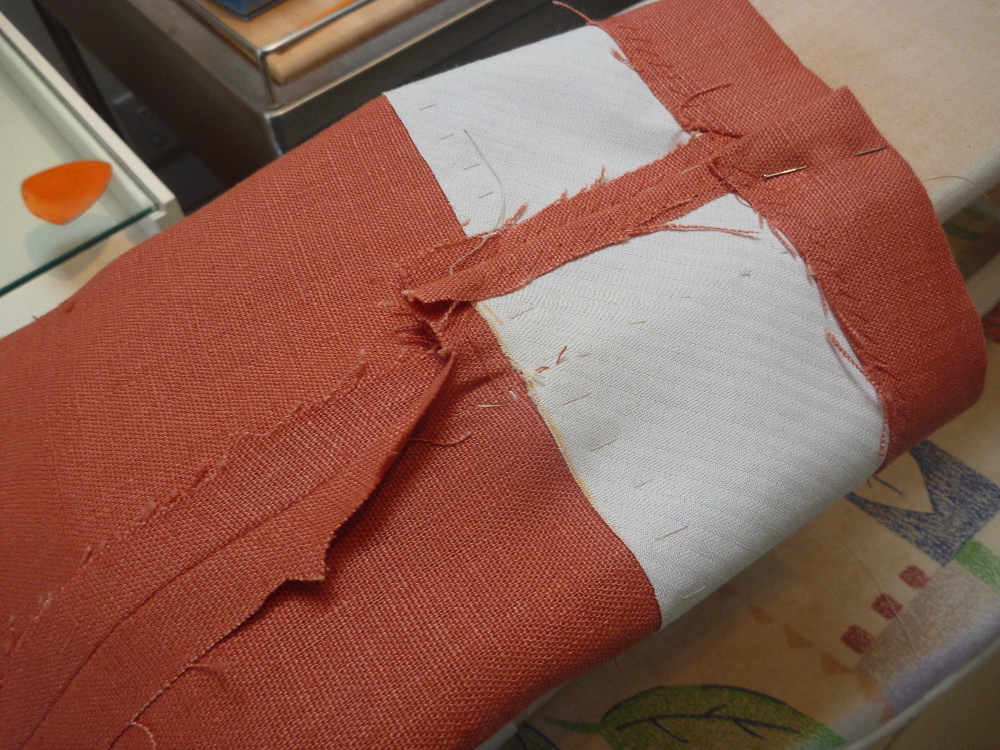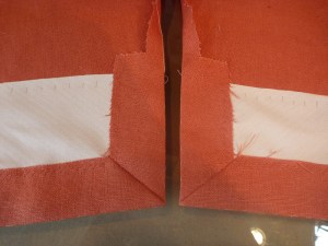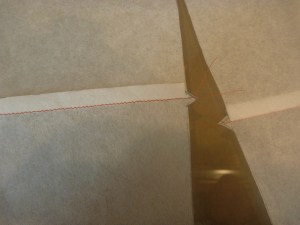 The sleeve cuffs are reinforced with a strip of bias cut pocketing material. It’s basted into place and then secured to the seam allowances to keep it from shifting around in the finished sleeve. The extensions are then folded, mitered and pressed into their final configuration. The sleeve is then machine stitched to 1/4″ below the vent extensions. Cabrera warns against clipping the seam at the overlap. The seam is just pressed open which will create a diagonal fold. In my next post the sleeves will be lined.