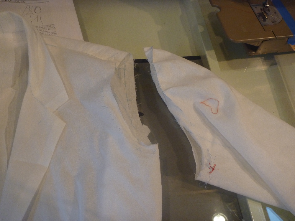 The next step is sewing and setting the sleeves. At this point Mr. Cabrera has one draft sleeves that will fit the wearer to a T. I just don’t feel that I have the skills or the time to wade through all this. Plus, I’m fitting myself, so I can’t stand in front of a mirror and pin a muslin sleeve onto myself. To err on the side of caution, however, I removed one of my muslin sleeves to check that it would fit the armscye. It did, so I’m moving forward.
