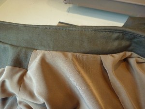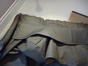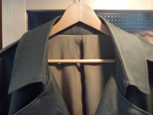 I started by basting the collar stand to the neck edge of the coat. The neck edge had been stay stitched and I clipped the seam every inch or so. The clipping lets the neck edge “flatten out” and makes attaching the collar much easier.