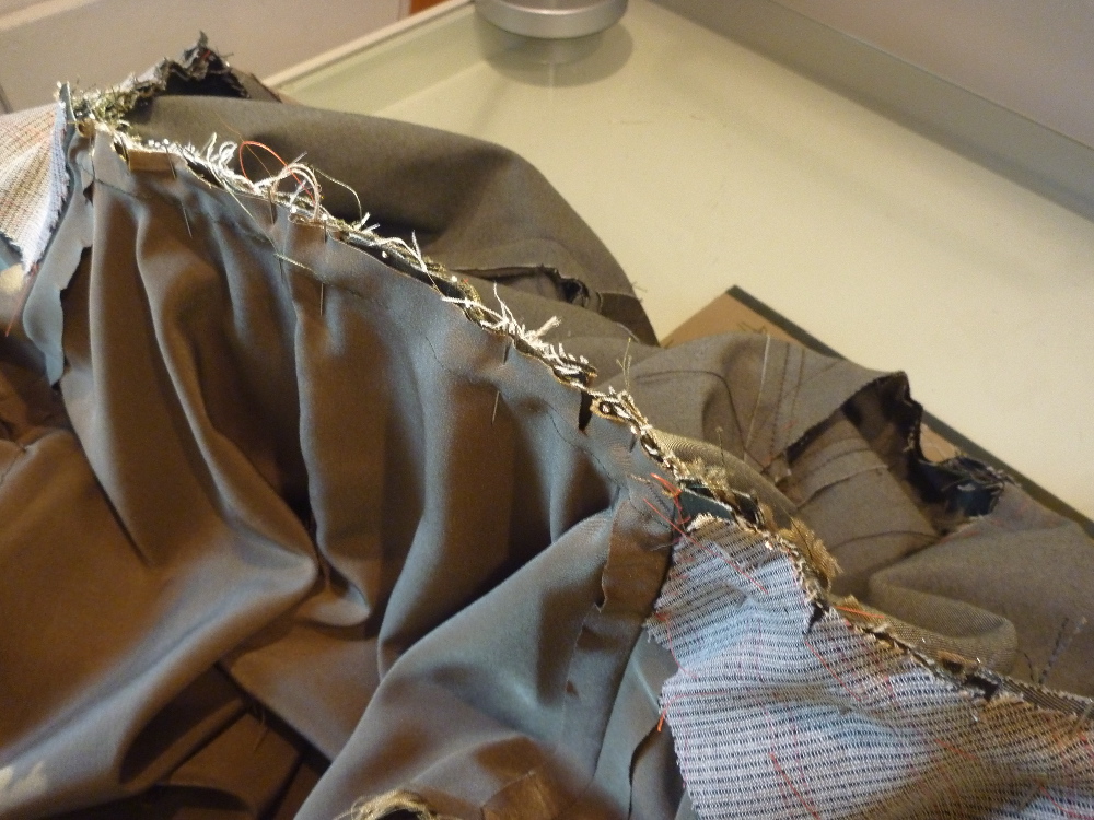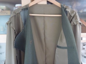 Sewing a lining in by hand may be tres couture, but it’s difficult to do and do well. You probably all know how much I hate working with polyester lining material, so the quicker I can be done with it the better. Here is the completed lining (minus its hair canvas front interfacing which was basted on after taking this photo). Truth be told, I almost forgot it! While making the muslin for this coat I figured out that I could attach the collar and the lining at the same time. The instructions (just diagrams) made it way too complicated.