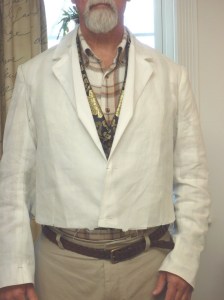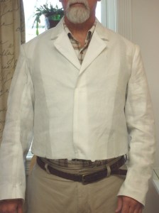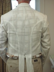 Here is the front as designed. It calls for 4 buttons down the front. It’s OK, but I have a fabulous vest that’s completely covered up. I really don’t care about historical accuracy, so my plan is to lower the roll line of the lapel so that some of the vest is revealed. This might require narrowing the lapel and the collar slightly. Both are easy fixes. All in all this project is getting off to a rough start. Making a muslin can be so frustrating, but obviously in this case it’s been well worth it. Next I need to tweak my patterns to match the changes I’ve made, and prep my fabric using the London shrink method.