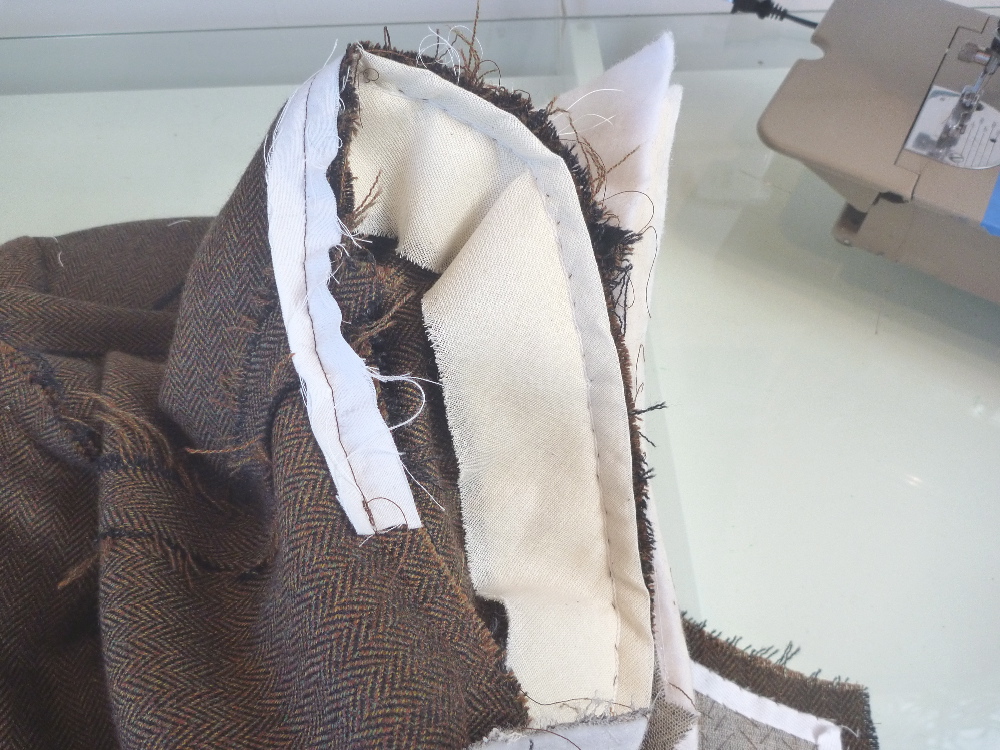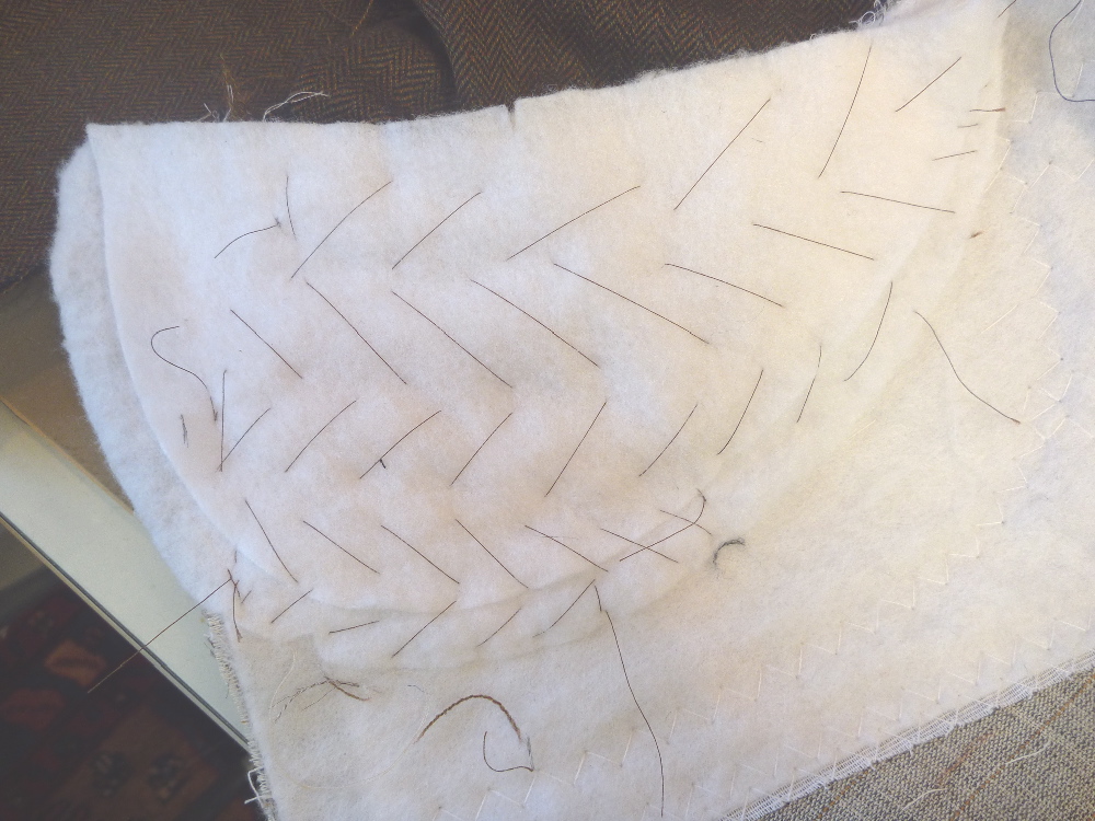 What the hell is going on here, you may ask? This is the shoulder pad being pad stitched into the chest canvas. While these stitches look huge, only a small amount of the canvas is caught with each stitch. It’s at this stage that the Cabrera book really starts to get confusing, so in a way I feel that I’m just winging it here. I believe the goal is to have the shoulder pad anchored only to the chest canvas so that the outer fabric is able to move freely over the pad. Makes sense to me. I’m just never sure what to do with the part of the shoulder pad that extends to the back. There’s no canvas, so I just leave it unattached past the shoulder seam. So far I’ve never had a shoulder pad fall out.