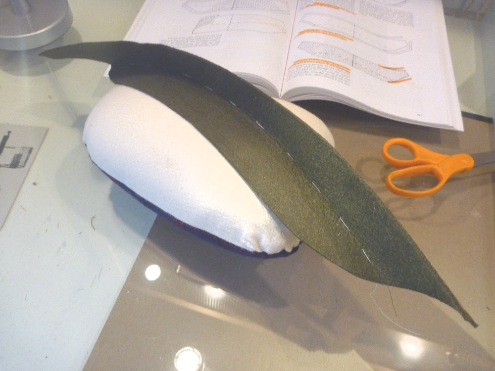 This is a felt undercollar that will be handstitched to the collar. You can see where I’ve basted the roll line and I’ve pressed it into shape over my tailor’s ham. BTW if you don’t have a ham I highly recommend getting one. You’ll be surprised how often you reach for it.