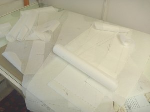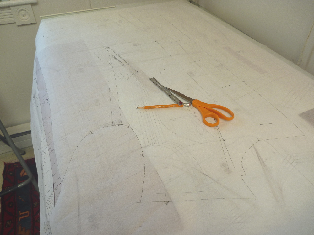 The patterns are traced using my trusty Swedish Tracing Paper. A wise reader from Africa informed me that once you know what adjustments you need to make on these patterns, you can apply them to every pattern. This has proven to be true. I know that I need an extra 1/2″ across the shoulder seam that extends down the length of the front and back, so I just make the adjustment during the tracing process. The sleeves will probably be too long, but I’d rather wait for the muslin to make that adjustment.