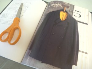 This is the coat. A double breasted pea coat with welt pockets. For those of you contemplating the book, there are 13 coats featured, but they’re really just themes and variations on 4 basic patterns. This one can be dolled up in a variety of ways. One can add epaulets and buttoned tabs at the cuffs. There are a variety of pocket options. There is even one version with gold braid everywhere that strikes me as very Michael Jackson. I’m going for the basic version. (I have a MJ inspired coat already!)