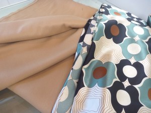 Here are my fabrics which I picked up in NYC’s garment district a few months ago. Thanks to my friend Martin for putting up with me during this expedition. I dragged him from store to store on a hot summer day shopping for wool! I ended up with a mid weight camel colored wool for $10/yd, and a printed acetate lining for $3/yd.