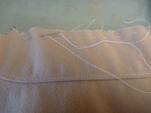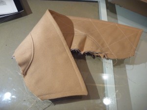 Both the collar stand and the undercollar are interfaced. The undercollar is cut on the bias and I’ll interface it with haircanvas also cut on the bias. You probably know by now that I’m just not a fan of fusible interfacing. This is probably because I’ve only ever used the stuff that’s available at JoAnn’s. It always seems to bubble up on me, and it just looks bad. The haircanvas may take a bit more time, but I’m always pleased with how it turns out in the end. Plus I’m a freak, I love all the handsewing! Anyway here I am cutting the bias interfacing using the collar stand as a pattern. I save just about every little scrap of haircanvas because they can frequently be used for things like this, or epaulettes, or sleeve tabs. Oh….. and I’m cheap!