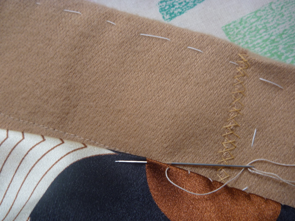 At the facings and vents the lining is folded down and slipstitched in place. This creates what is called a take-up tuck, and prevents the lining from pulling up the hem when the garment is worn.