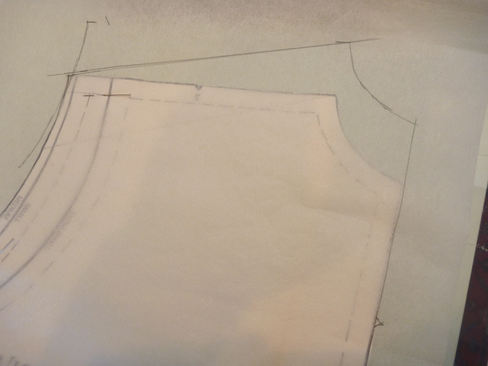 Now I move to the front for fix #2 — the sloped shoulder adjustment. The pattern as drafted would only fit me through the shoulders if I inserted HUGE shoulder pads. So I need to increase the slope of the shoulder seam. It’s a two step process. The neck opening and front edge of the shirt will stay the same. I drop the sleeve edge of the shoulder seam down 2″ and redraw the cutting line from the original neck line. Above you will see my new pattern laying over the original.