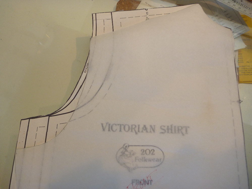 Now I slide the pattern up until the new shoulder / sleeve point meets the original armscye. The armscye is then retraced. This process raises the center front of the shirt somewhat, so it may be necessary to drop the neckline just a touch. I’m OK with it, so I’ll leave it alone. But if I did want to make that adjustment it would be very small, no more than 1/4″.