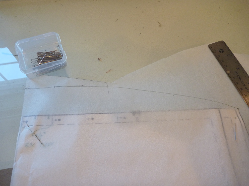 Fix #1 is the easiest — adding some shape to the back. I start by laying a piece of Swedish tracing paper over the pattern. As you can see the top of the back on the pattern is completely straight where it attaches to the yoke. Therefore, there is no shaping to the back. The shirt will fit better if the back seam is curved. Starting at the shoulder seam I’ve drawn an arc up to a point 1.5″ above the existing pattern. That’s it. The curved back sewn to the straight yoke will act like two horizontal darts pointing to the center of the back. You may also notice that the pattern as drawn has 7 small tucks across the back. Personally I think that’s more woman’s blouse than man’s shirt, so I’m going to fashion the excess fabric into a center box pleat.