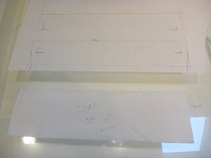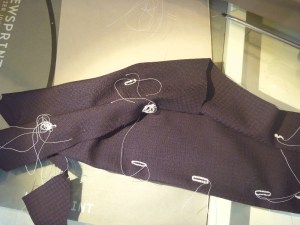 I drafted a pattern for the doubled back cuff based on an idea from David Coffin’s book. The cuff flairs out a bit from where it attaches to the sleeve. Things were moving along well. The cuffs were cut, interfaced, attached and I was ready to edgestitch them. While edgestitching I suddenly felt a lump in the cuff. A piece of fabric that I had trimmed from the seam ended up inside the damn cuff. I had to rip out a bit of the cuff seam and fish out the piece of fabric. Little things like this can really make me come unglued. I fixed the problem and regrouped.