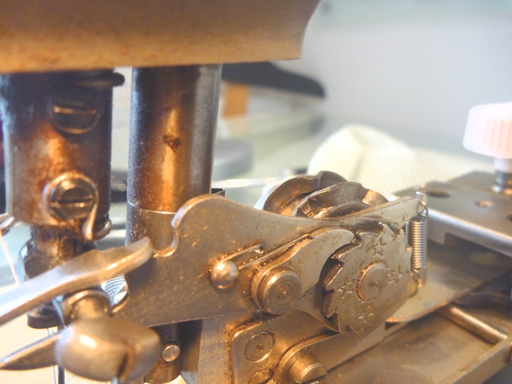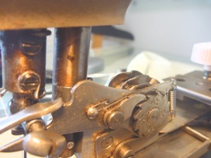 This is the center of the action. The part on the left that looks like a bird’s beak is attached to the shank of the machine. As the shank moves up and down the ratchet behind it pushes the cogged gear. This in turn produces the much needed wiggle. The problem was that the ratchet wasn’t quite connecting to the gear when the needle was at its lowest point. It took me forever to figure this out, and I won’t go into all the gory details. If you have one of these gizmos, be sure you have a 1/8″ allen wrench. ‘Nuf said.