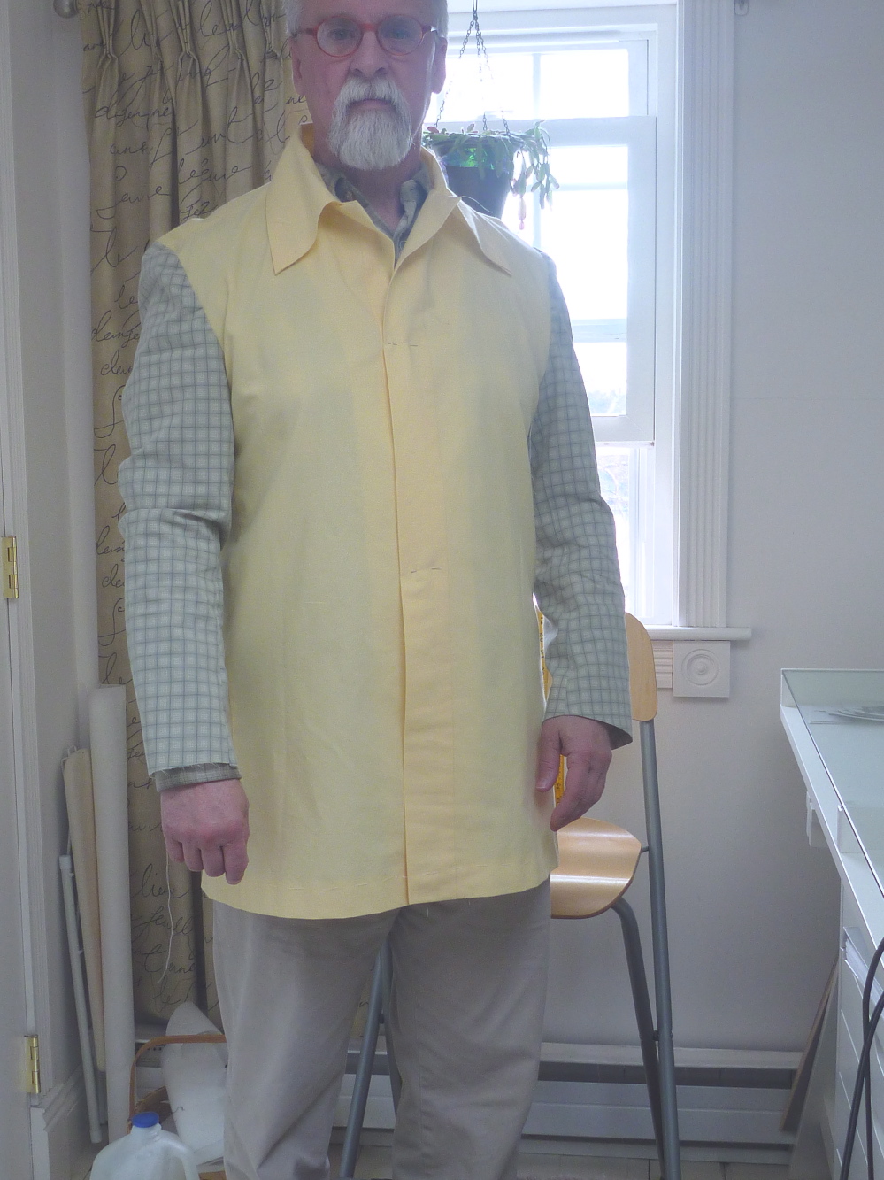 From the front I’m pleased with the fit across the chest. For once there doesn’t appear to be any need for a shoulder adjustment. I did think the fit was too snug at the waist and below so I let the front / side seam out by 1/2″ on each side. The extra inch of ease at the front made a huge difference. BTW the left sleeve is the final version.