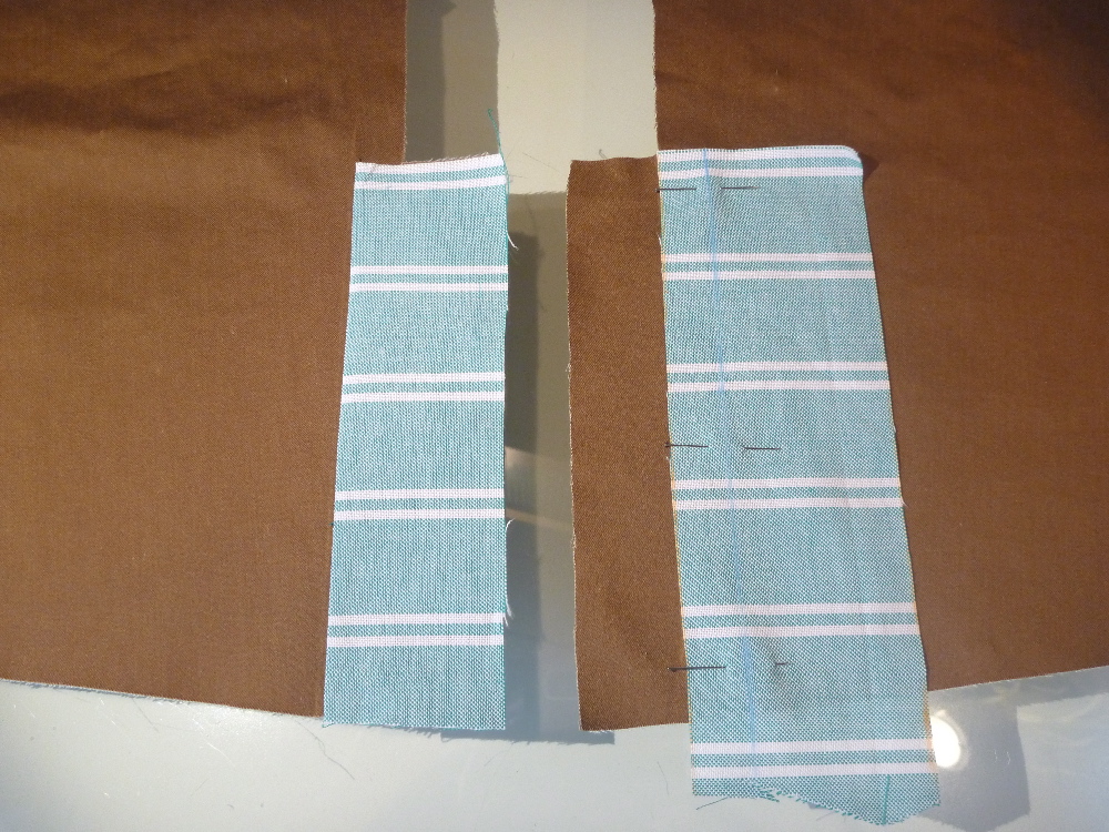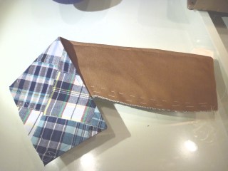 My plan has been to add some contrasting fabric to the sleeve vents. I extended the stitching line of the undersleeve vent and pinned a scrap of oxford cloth along the line. The stitching line is faintly marked with blue chalk on the right above. After stitching, the oxford cloth is pressed over the vent extension, trimmed and basted into position.