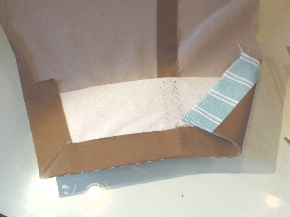 Using the basting as a guide the cuff is folded up and a mitre is formed at the uppersleeve vent. This potentially allows the sleeves to be lengthened, although I don’t expect my arms to be growing! The fashion fabric is hemmed into the muslin. I slide my fingers in behind the muslin to prevent catching the fashion fabric. I serged the edge of the undersleeve to save some time. I’m sure Roberto would be appalled, but this is just a casual jacket after all.