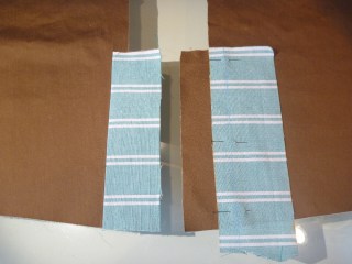 Here is the completed vent. I will probably secure it with a single button so that a hint of the contrasting fabric will be visible.