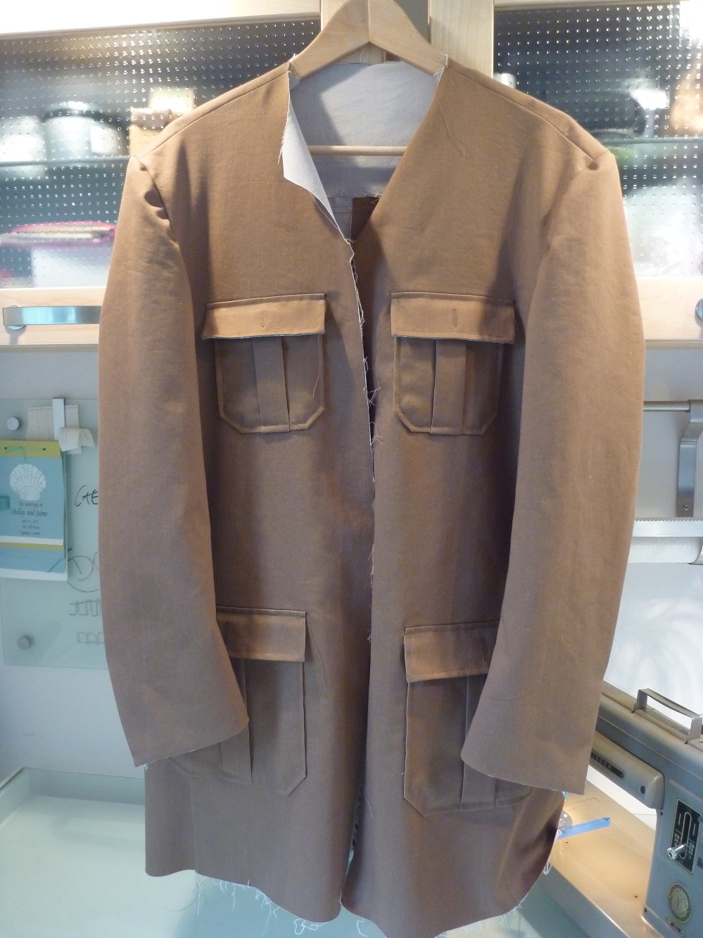Here is the jacket so far with its sleeves attached. I’m counting on some interfacing and substantial wool sleeve heads to give it some much needed shoulder structure. Fingers crossed.