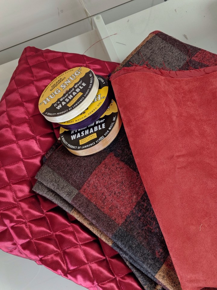 Then at this past Summer’s MPB Day, I picked up the other bits that I’d need. A quilted lining from AK Fabrics, and a coordinating faux suede from Mood. (Also buttons from Pacific Trimming).