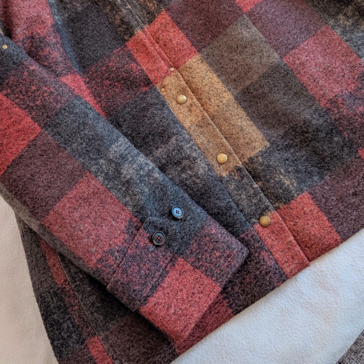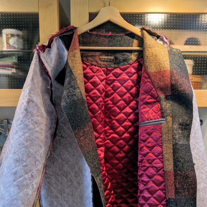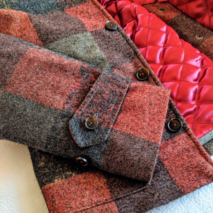 At the MPB Winter Frolic last year, my friend Kyle Burkhardt picked up a great checked fabric in sort of “autumn tones” at Metro Textiles. I would never have noticed it without her. It’s actually a double knit with stretch crosswise, but not lengthwise. I love the colors… rusty reds, golds, grays. It has a slightly brushed finish and “wooly” look. The idea of moving away from the conventional solid color canvas jacket, to something more unique suddenly became very appealing. And isn’t that the super power of being able to make our own clothes? I walked out with 3 very generous yards and visions of a new coat swirling in my head.