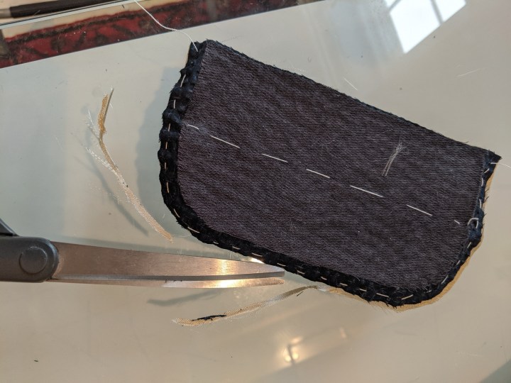 Here’s the tricky bit, so just be patient with yourself. Pull the edge of the flap back, and baste it in place with small stitches to make a border of lining about 1/8″ wide.