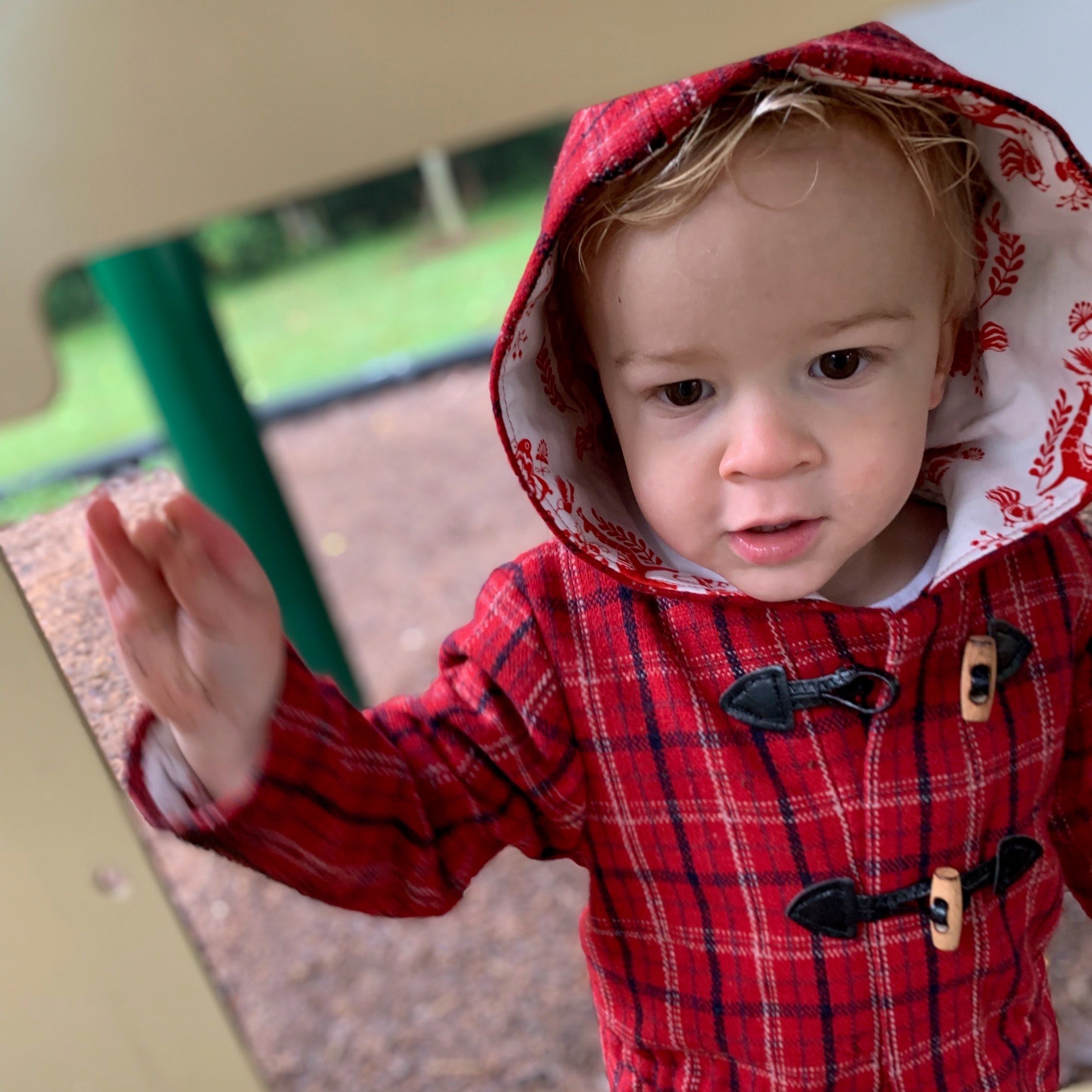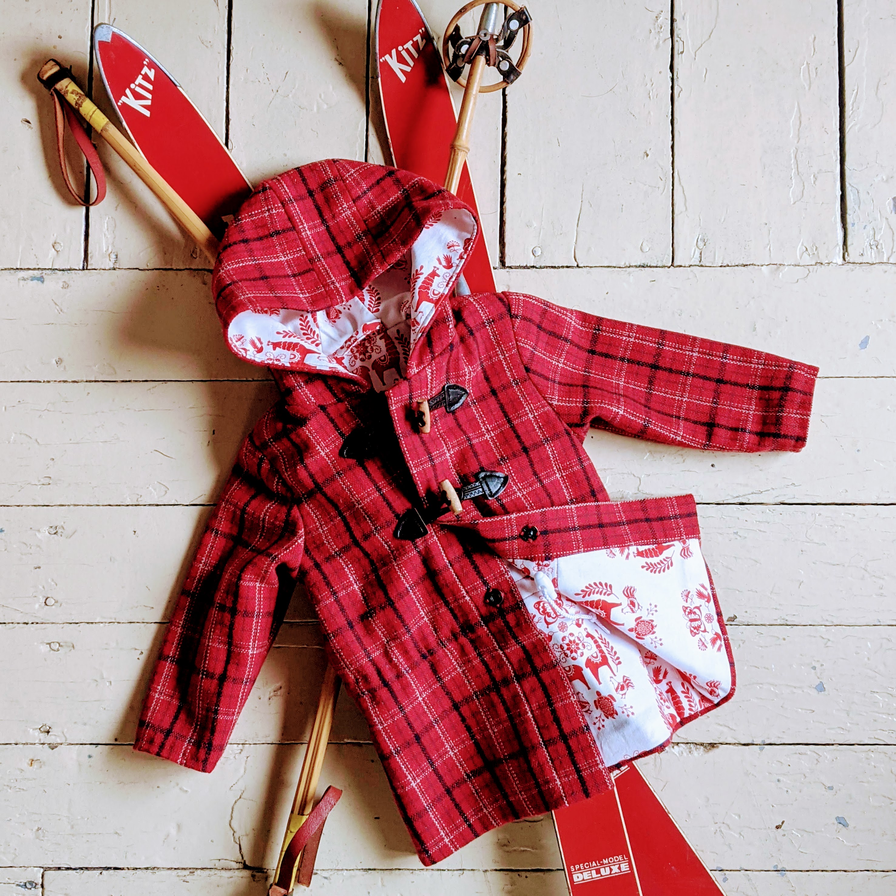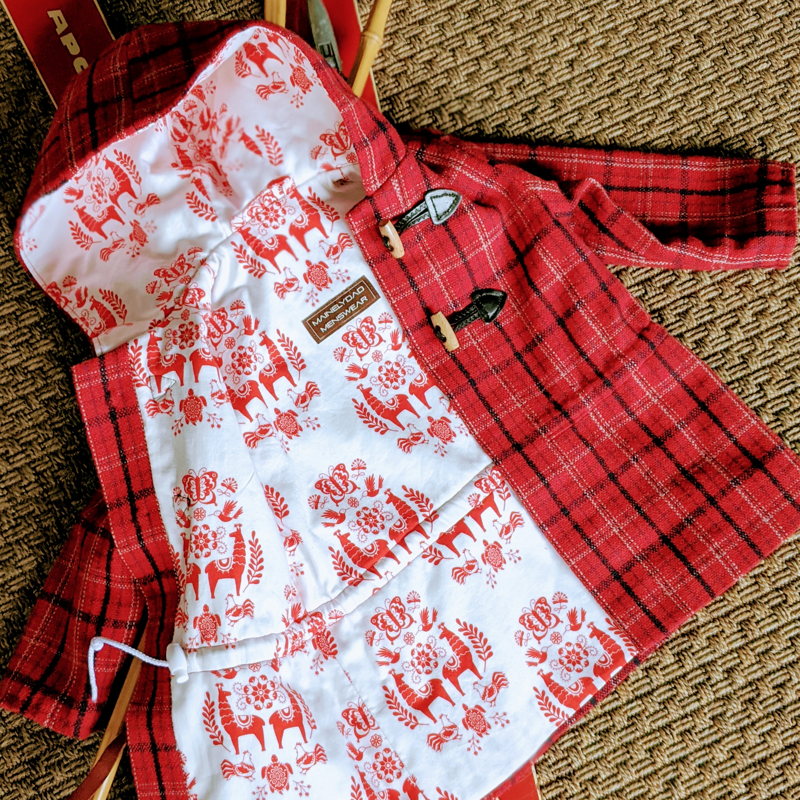 The plaid fabric is only 20% wool which turned out to be a great choice for a toddler. Don’t gasp, but I actually prewashed it in the washer and took it to the laundromat to dry it on high heat. I don’t think there was a bit of shrinkage. Who knows what might eventually get spilled on this coat. I’ve told my son and daughter in law that there’s no reason not to throw the whole thing in the wash. It should come out just fine.