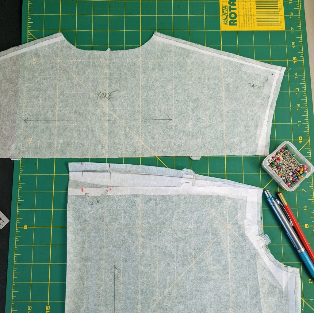 I almost always have fitting problems at the back of a collar. Because my upper back has curved forward with age, collars will pull away from the back of my neck. On a shirt with a yoke like the Olya, I counter this by adding a curve to the back piece. This provides the extra length that’s needed for the collar to move forward. The adjustment looks like this. The bottom of the yoke remains straight (important if you’re working with a striped fabric).