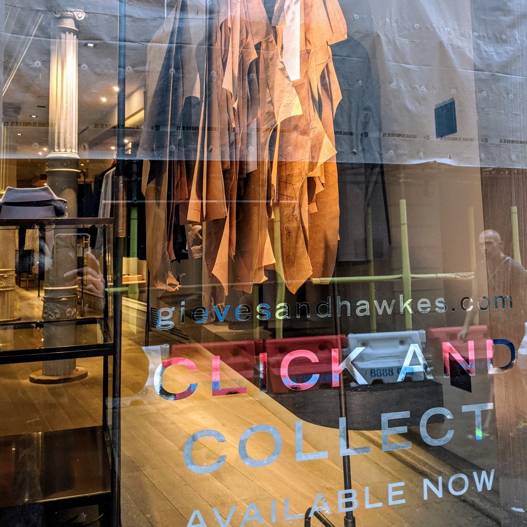 For the life of me I can’t imagine what one “Clicks and Collects” at No.1 Savile Row! There was a lovely brown tweed suit in one of the windows. Just the kind of thing I would love to be making some day. The interior is grand to say the least, with a balconied mezzanine running around the lofty interior. The clothes, however, struck me as less spectacular. Of course it’s all ready to wear in the store (the bespoke business takes place behind closed doors); but regardless, it struck me as very bland. I did a quick loop and was out the door without taking a single picture.