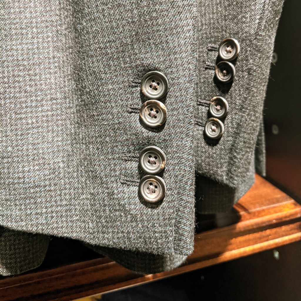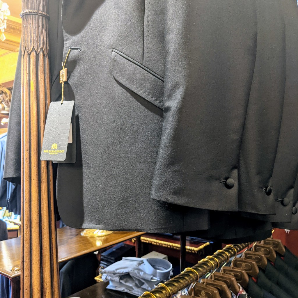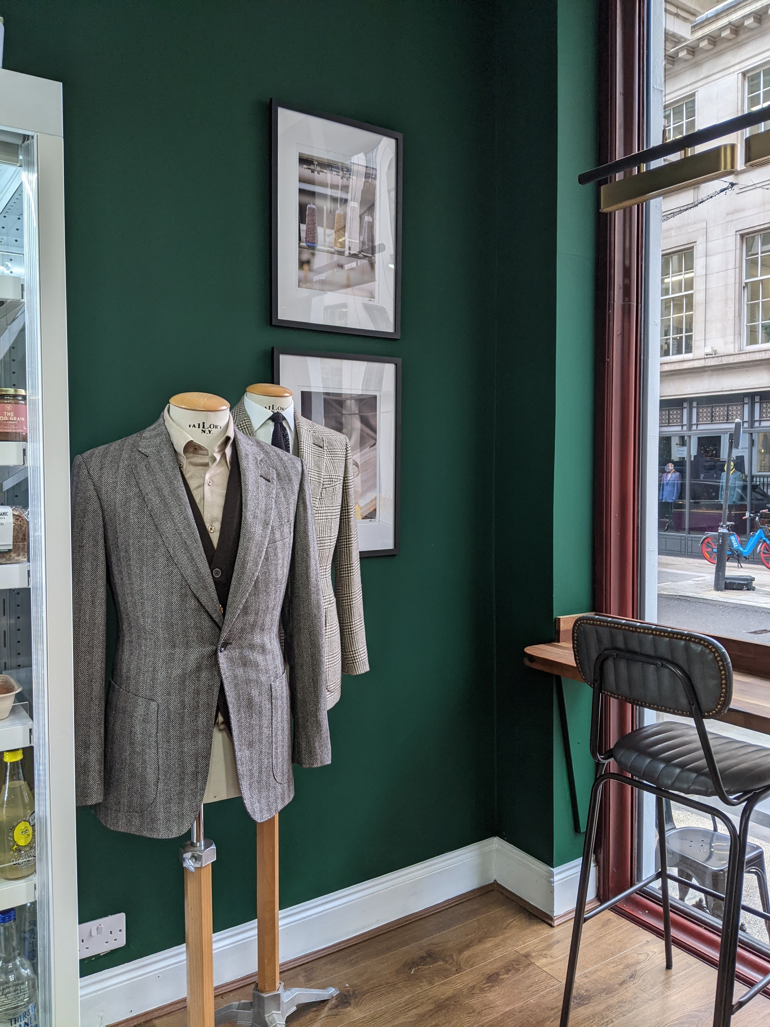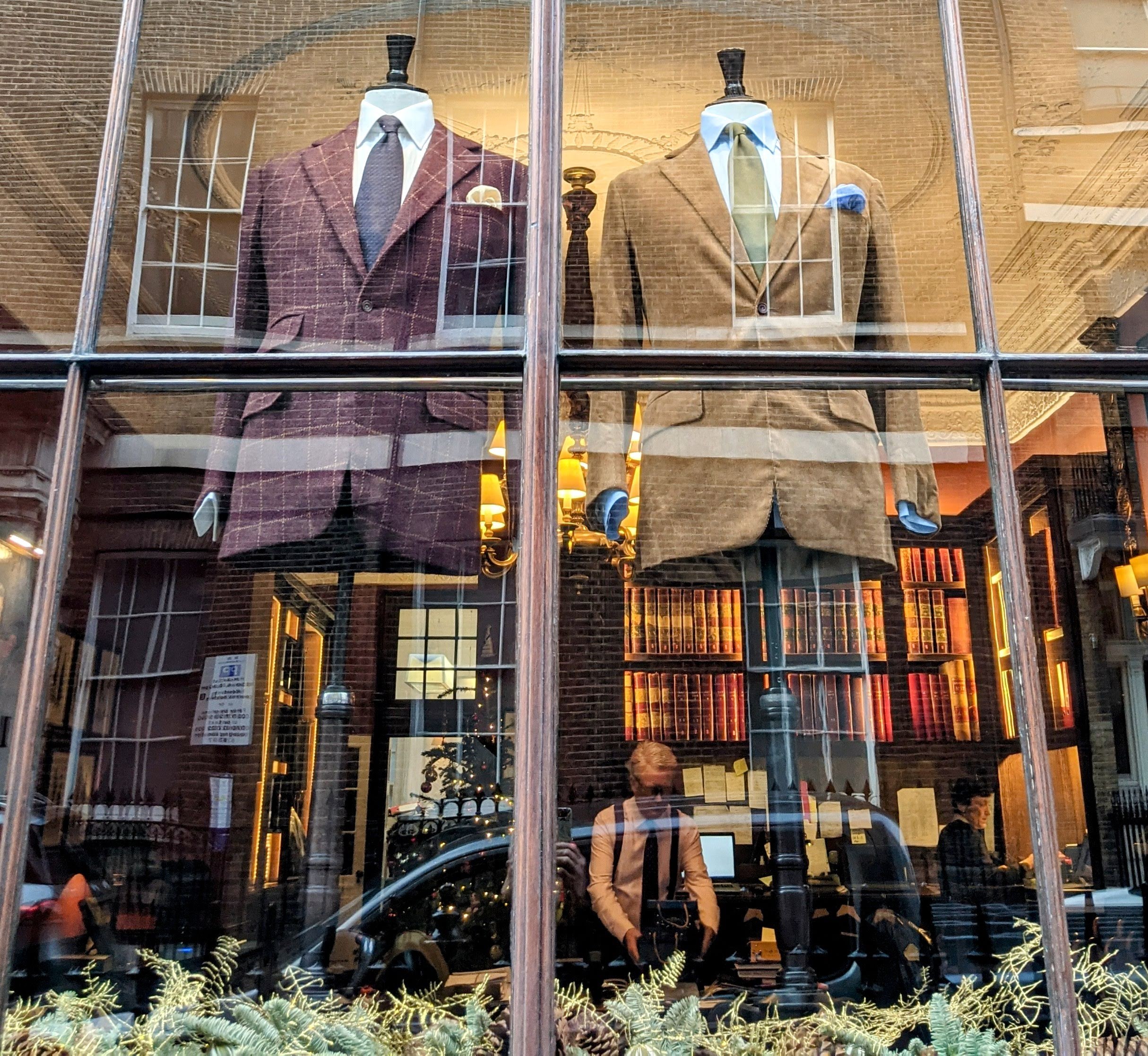 I’m an early riser and I arrived on Savile Row before many of the establishments were open, so I stopped in for coffee at The Service. Americano with warm milk on the side, thank you. There are even tailored garments in the coffee shop! Can this be real?