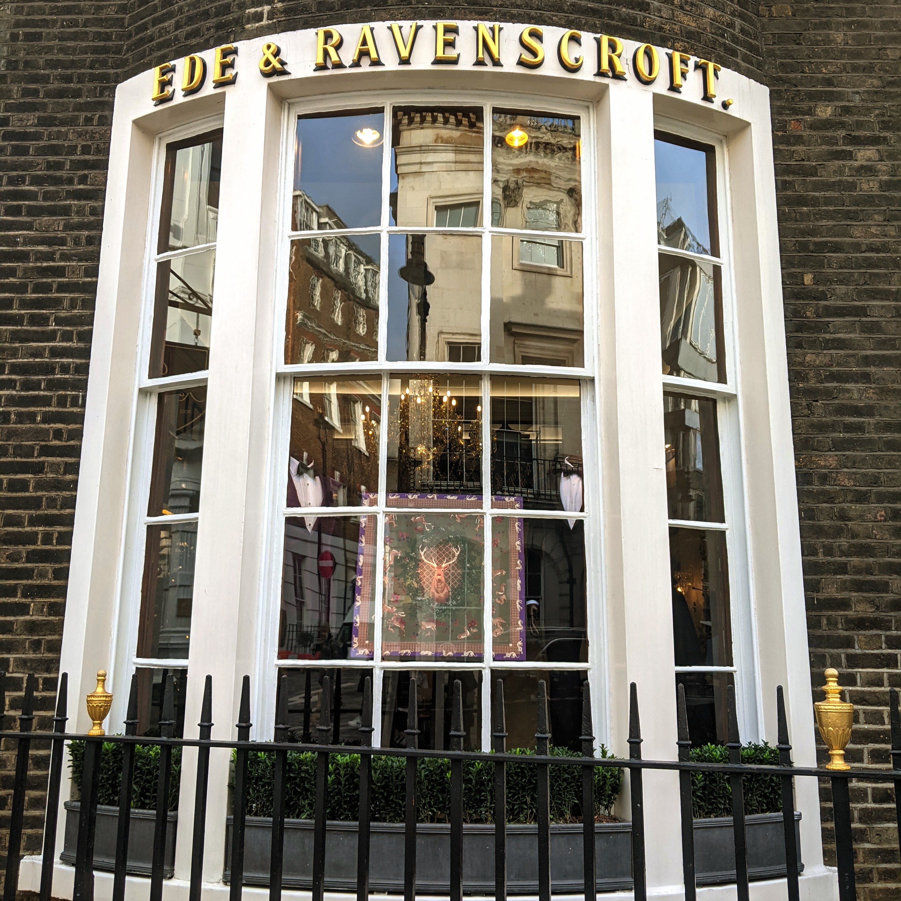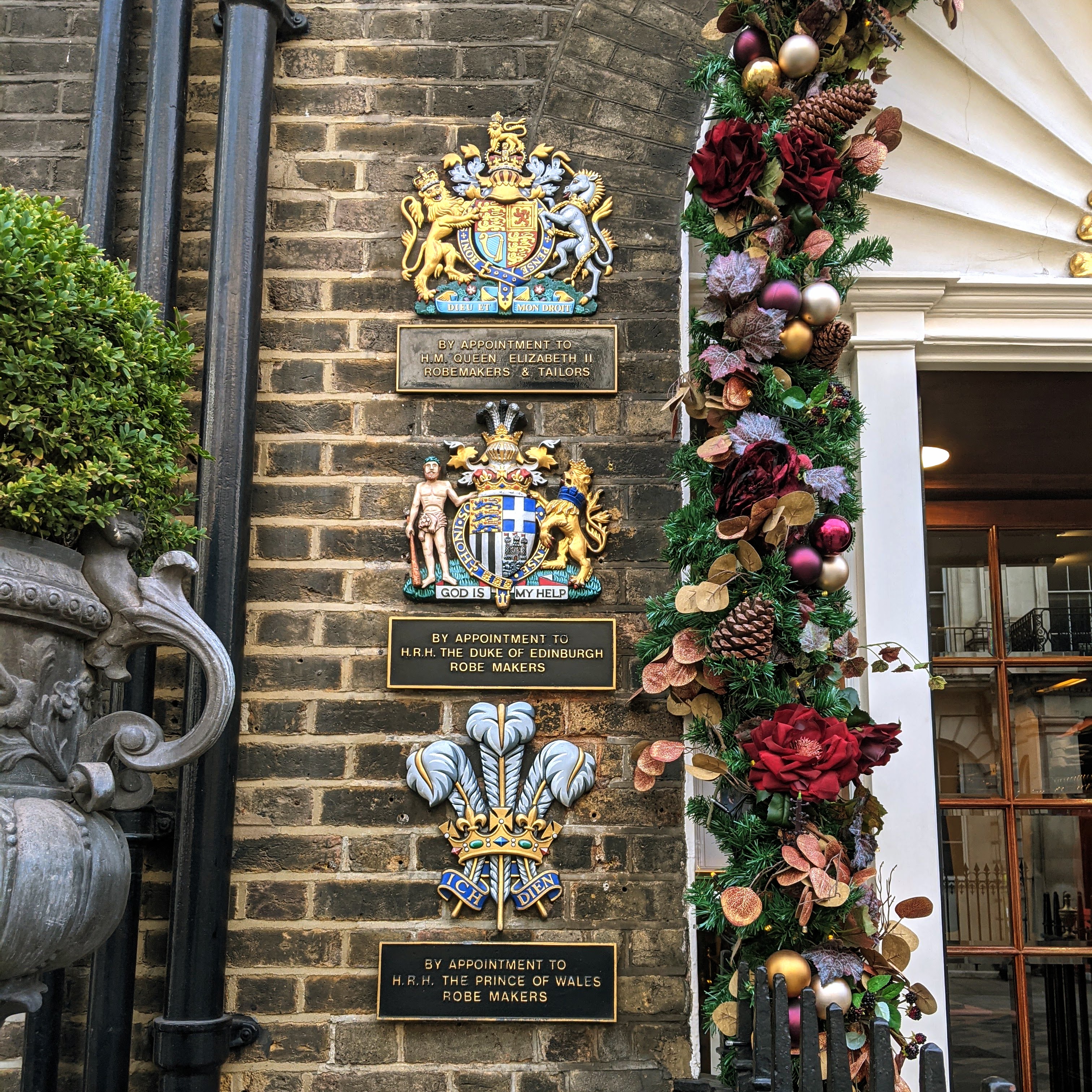 Kitty corner to Gieves & Hawkes sits Ede & Ravenscroft. It’s bowed window stares right down the center of Savile Row. It’s also hard not to notice that they have a few Royal Warrants, in addition to lovely holiday decorations circling the front door !