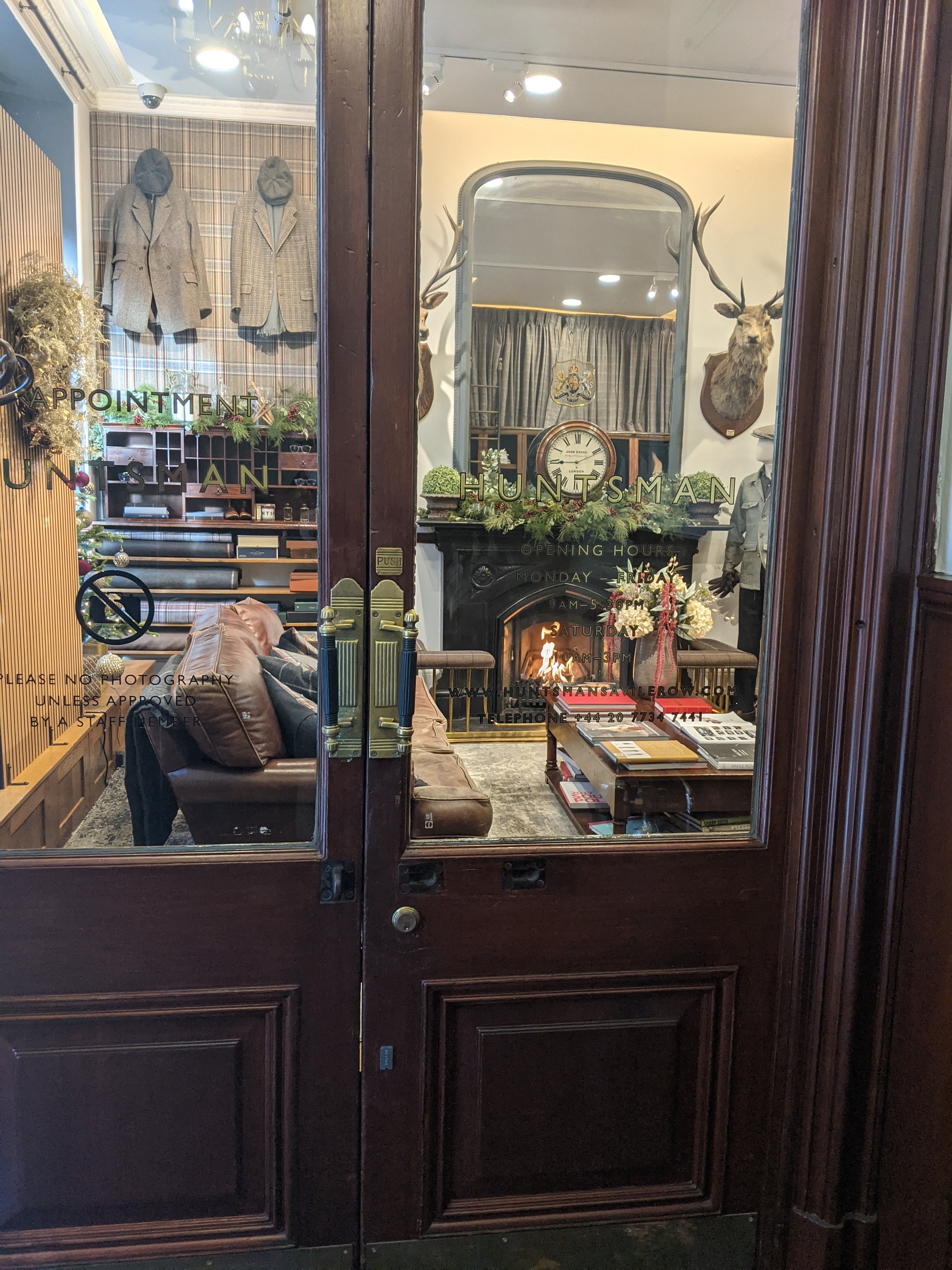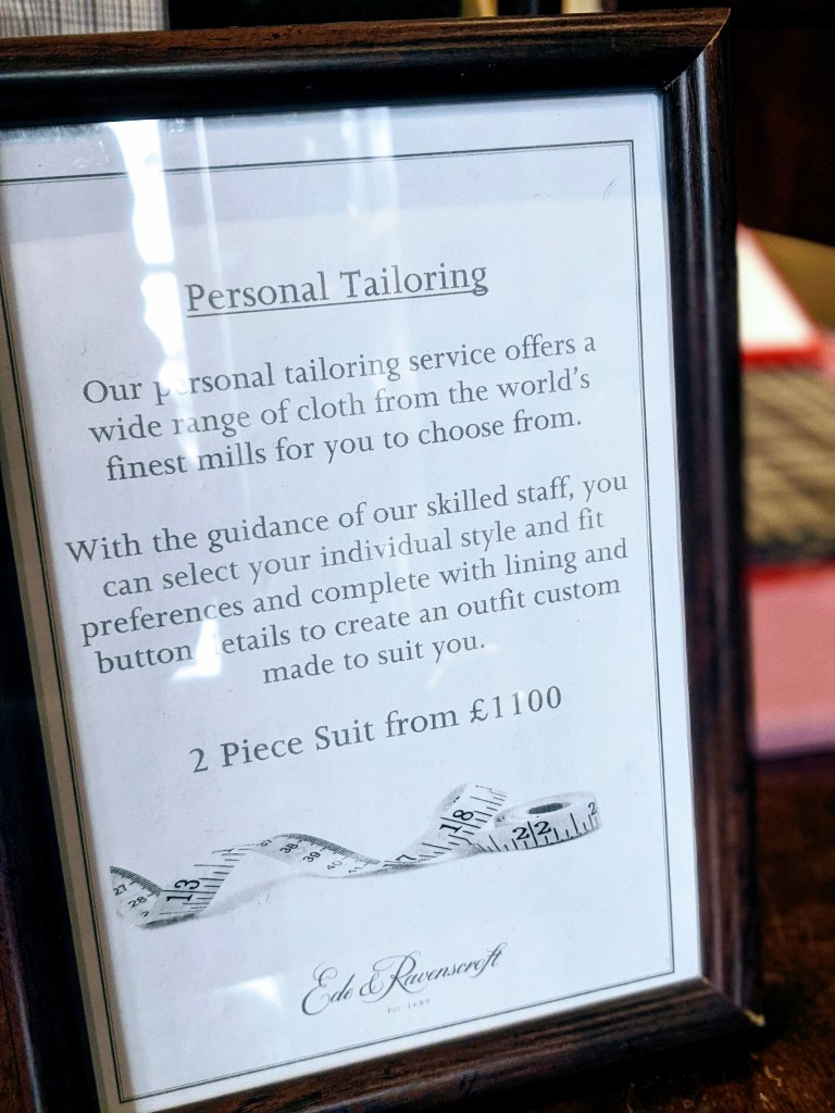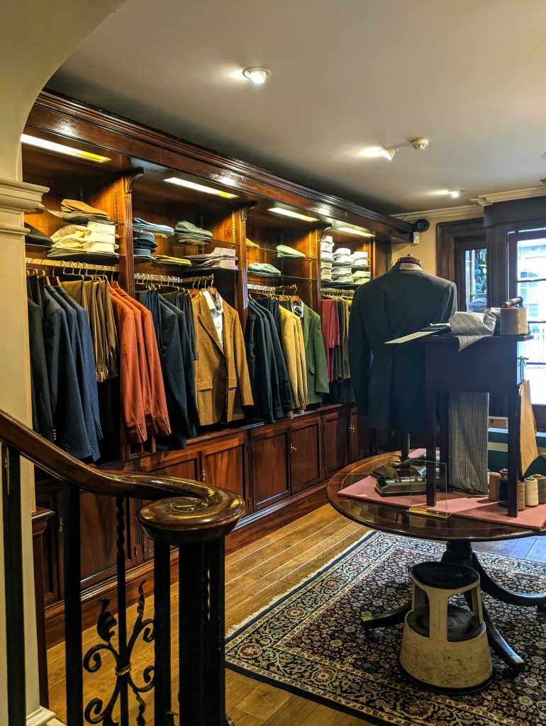 I snapped a picture of Huntsman through their front doors. They were working with a client at the time, so I beat a hasty retreat. One has to realize that the “one to one” personalized experience is at the core of Savile Row. There’s a right and wrong time to be a gawker! This also happened at Norton & Sons, which is owned by Patrick Grant of The Great British Sewing Bee fame. The decor there is the opposite of Huntsman, a contemporary “art gallery” vibe. The client there appeared to be in his 30’s maybe? Proof that bespoke isn’t just for affluent old men.