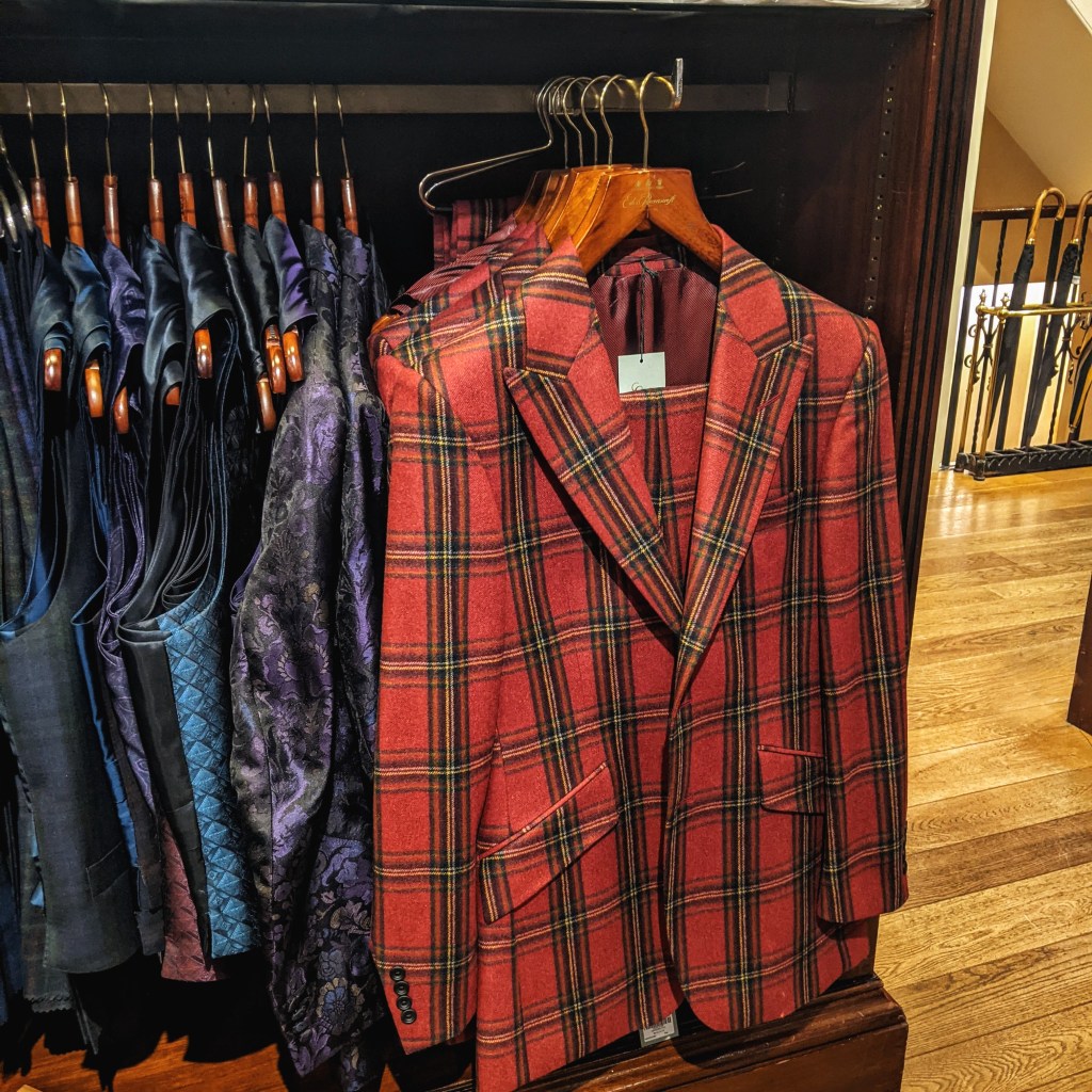 The gentleman working on the ground floor was a delight (more on that observation later), and the clothes were a welcomed sight after the somberness of G&H. The front hallway was full of tweedy wonders and moleskin trousers in brilliant colors. I wanted them all! The pick stitching on the Loro Piana “Dream Tweed” was dreamy in its own right. Formal wear was given a jolt with patterned waistcoats in every color of the rainbow. I’m sure someone is the life of the party, wearing that red tartan suit somewhere in London. Clearly, this is the shop for men who want color. Being the guy who’s been working on a purple tweed jacket since September, this store was screaming my name!