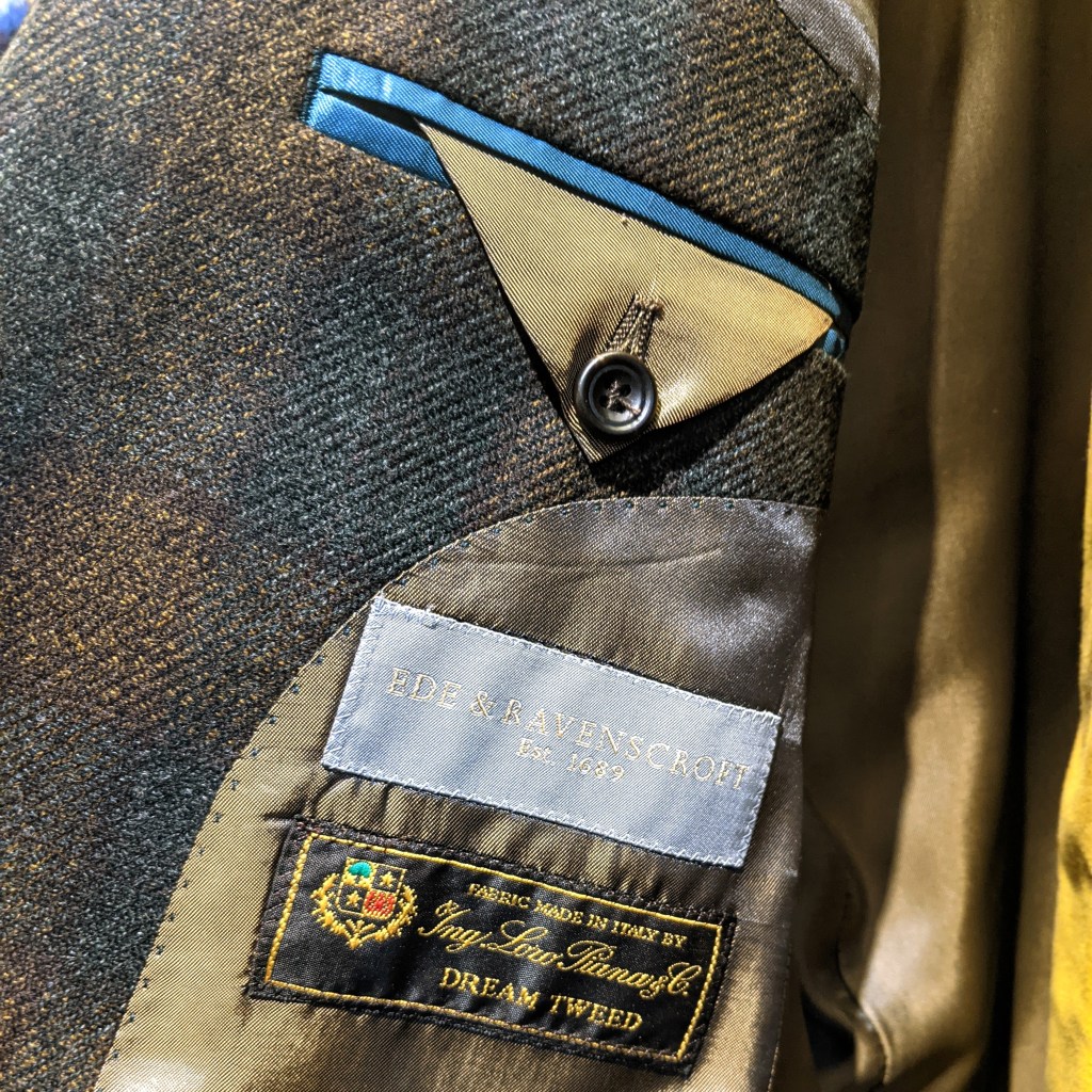 I think there were four cutters, (three men and one woman), all much younger than I would have imagined. It was encouraging to see that there are young people interested in keeping this craft alive. Because they travel to major cities all over the world, there’s a large volume of work in the pipeline. The average lead time they explained is around 3 to 4 months, depending on the garment. Something like a raglan overcoat or a customized pair of riding breeches might be even longer due to the number of fittings. I got the feeling that nothing is off the table at Anderson & Sheppard. What the customer wants, the customer gets. They even have their own proprietary tweeds that are produced in Scotland by Woven in the Bone. The samples were displayed in the hallway connecting the front room to the cutting room. “Bespoke squared”. A bespoke garment made with bespoke cloth!