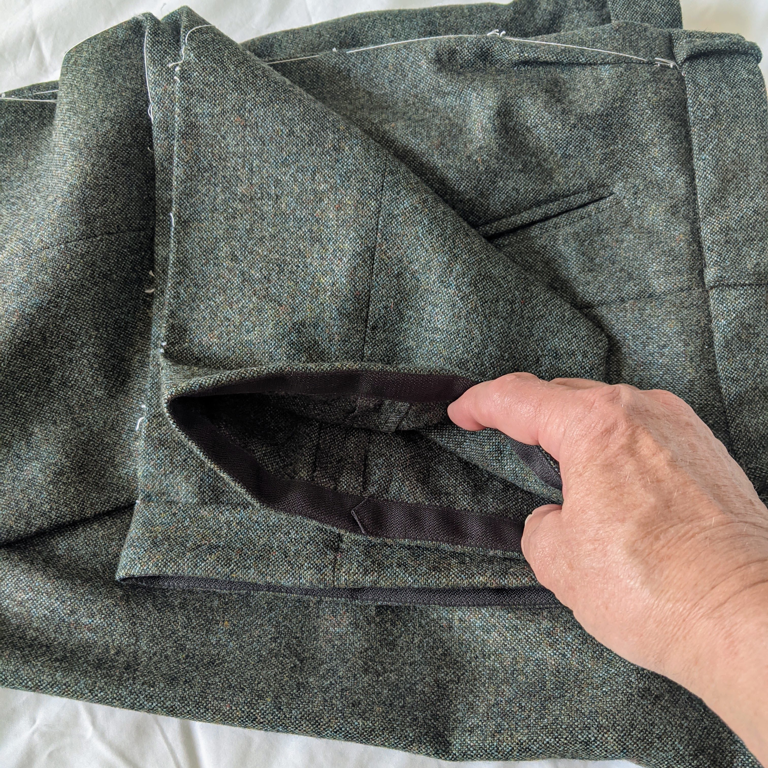 If there was a saving grace for the entire project, it would have to be the kick tape at the hem. I had never used it before, and it truly “kicks” them up a notch. The fabric doesn’t hurt either. Shetland tweed from Abraham Moon & Sons.